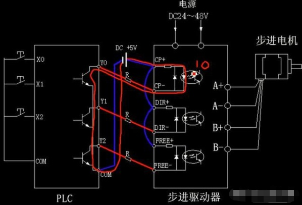 步進驅動器最先要外接直流電源24~28V,一端要連步進電機,另一端作鍵入數據信號也就是操縱數據信號,步進電機接納外界數據信號的構造是選用光學防護的,例如:PLC的差分信號送至控制器內部,我們要使PLC造成單脈沖只必須讓Y0持續的接入與截至就可以造成。