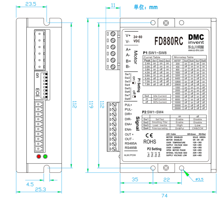 FD880RC產品是東么川公司采用先進的DSP控制芯片與獨特的控制電路結合 一起所構成的新一代智能數字式細分型步進電機驅動器,基于精密的PID電流控制算法設計,高速大力矩輸出,靜止時動態電流自動減半,使電機溫升大為降低,最大限度發揮電機的性能,用戶可以設置1—12細分,低中,高速運行都非常平穩,幾乎沒有振動和噪音,安全解決了步進電機低速振動和噪音的缺陷,驅動器內部集成了參數自動調整功能,能針對不同參數電機自動生成最優的運行參數。