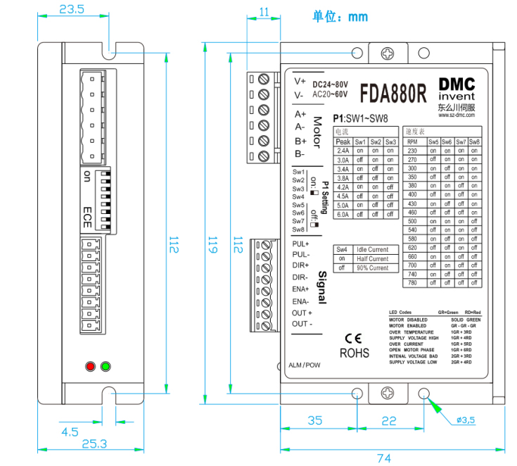 FD880R產品是東么川公司采用先進的DSP控制芯片與獨特的控制電路結合 一起所構成的新一代智能數字式細分型步進電機驅動器,基于精密的PID電流控制算法設計,高速大力矩輸出,靜止時動態電流自動減半,使電機溫升大為降低,最大限度發揮電機的性能,用戶可以設置1—12細分,低中,高速運行都非常平穩,幾乎沒有振動和噪音,安全解決了步進電機低速振動和噪音的缺陷,驅動器內部集成了參數自動調整功能,能針對不同參數電機自動生成最優的運行參數。
